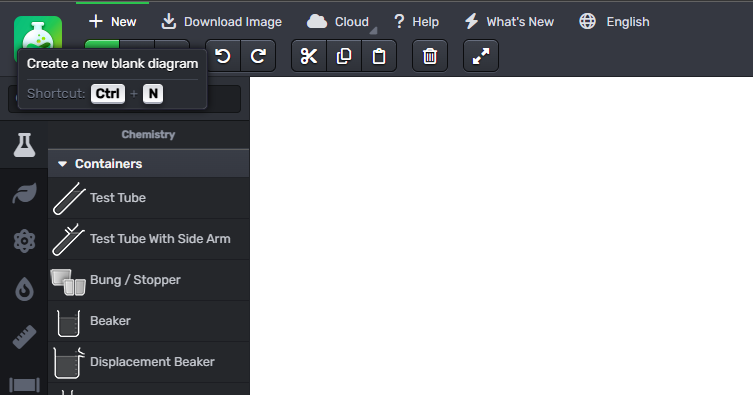 When you open Chemix, it will have a beaker added to get you started. To start a blank new diagram, you can select it and press Delete or Backspace to delete it, or press the "New" button in the top bar to start a new diagram.